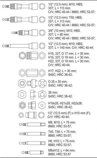 materiál adaptérů: vykované z CrV (Chrome Vanadium) oceli