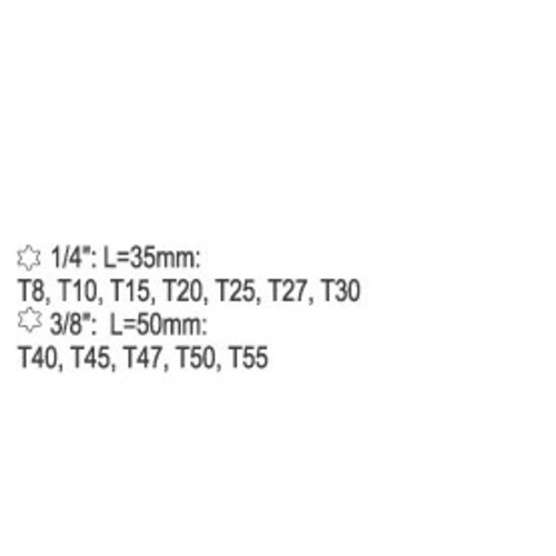 Délky bitů 37 a 48 mm, určené pro 1/4" a 3/8" ráčny. V sadě je kovový držák bitů a samotné bity T8-T55. Splňuje normu DIN 3120 pro vysoce-zatěžovatelné nástavce