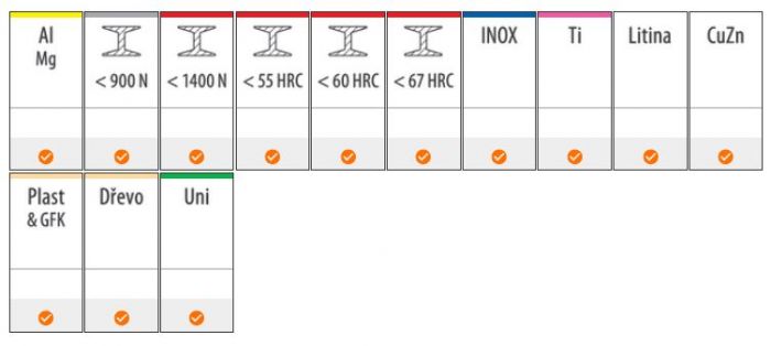 • Dobře třískově obrobitelné oceli, nerezové oceli, hliník a neželezné kovy, všechny plasty.