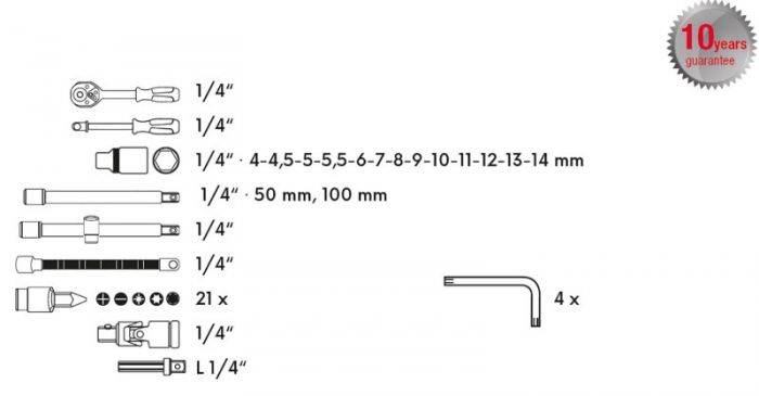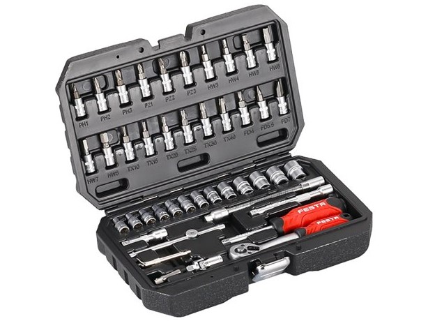 Kvalitní gola sada je vhodná díky kvalitě použitých materiálů a zpracování v profesionální autodílně nebo servisu. 10 let záruka. Všechny části jsou vyrobeny z vysoce kvalitní chrom-vanadiové oceli. Niklová povrchová úprava. Hroty bitů jsou ze slitiny oceli S2. Ráčny mají jemné dělení 72 zubů, tělo ráčny z CrV oceli, zubový mechanismus z S2 oceli, ergonomicky tvarovanou rukojeť se zdravotně nezávadnou gumou. Nový design plastového kufru z primárního materiálu s kovovými uzávěry a panty víka.