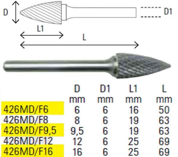 Rotační pilníky plamen špičatý, vyrobené z tvrdokovu 426MD/F stopka 6mm