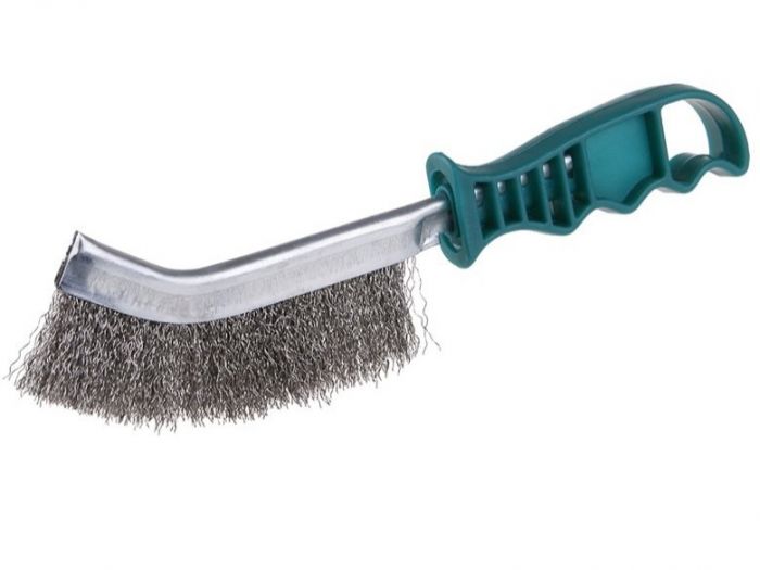 Nerez kartáč - ruční, kovové tělo s plastovou ergonomicky tvarovanou rukojetí, vlnitý drát - nerezová ocel, počet drátů 1480, použití: k čištění železných kovů jako je ocel, nerez, litina, … .