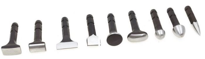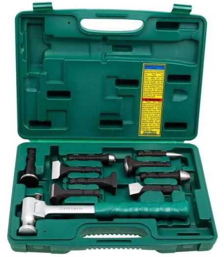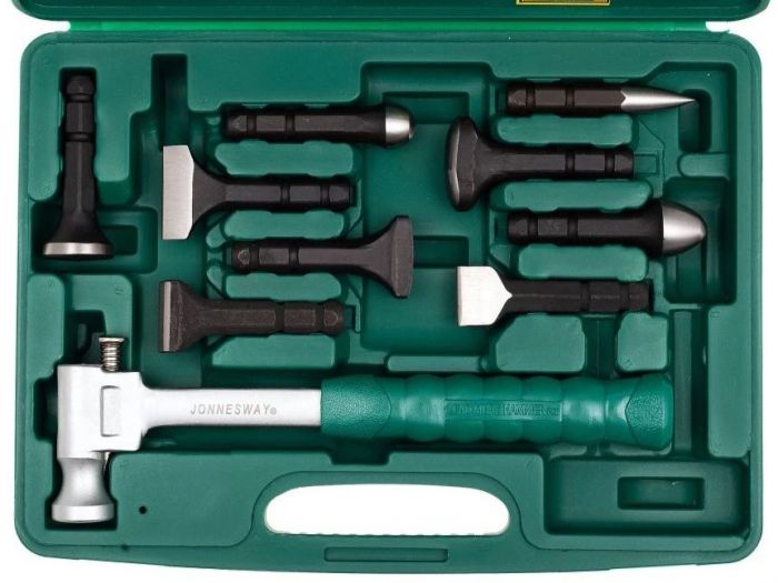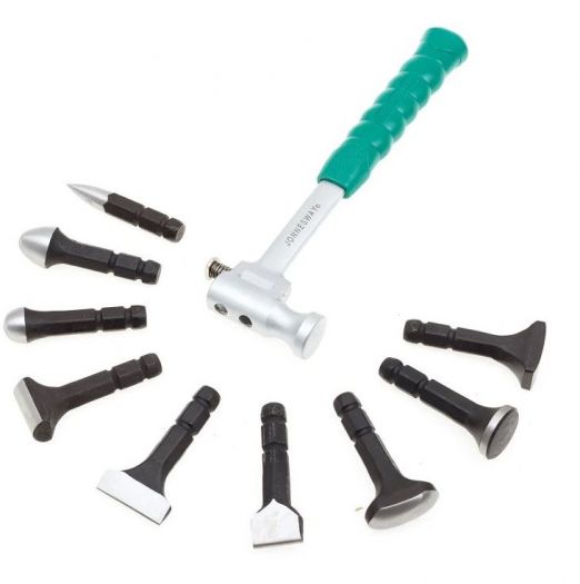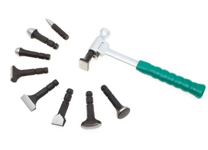 Praktická sada pro karosáře nahrazující několik samostatných nástrojů. Obsahuje 9 kusů různých typů hlav určených pro rozmanité karosářské práce (opravování karosérií, práce s plechem, modelování atd.).